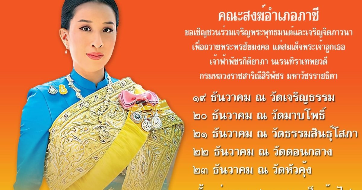 คณะสงฆ์อำเภอภาชี ขอเชิญชวนร่วมเจริญพระพุทธมนต์และเจริญจิตภาวนา เพื่อถวายพระพรชัยมงคล แด่สมเด็จพระเจ้าลูกเธอ เจ้าฟ้าพัชรกิติยาภา นเรนทิราเทพยวดี กรมหลวงราชสาริณีสิริพัชร มหาวัชรราชธิดา