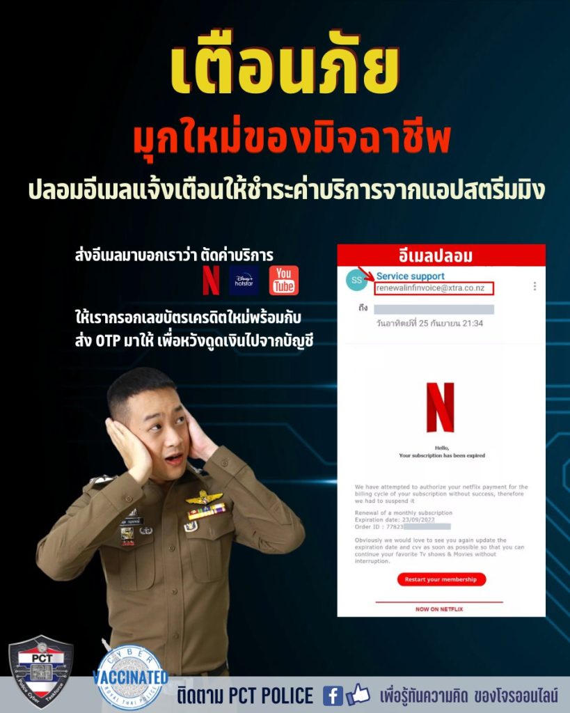 มิจฉาชีพจะส่งอีเมลปลอมแจ้งเตือนให้ชำระค่าบริการ จากแอปสตรีมมิงดังค่ายหนึ่ง มิจฉาชีพเปลี่ยนวิธีการแล้ว จะส่งอีเมลมาบอกเราว่า ตัดค่าบริการ Netflix, Disney Plus, YouTube หรือ Premium