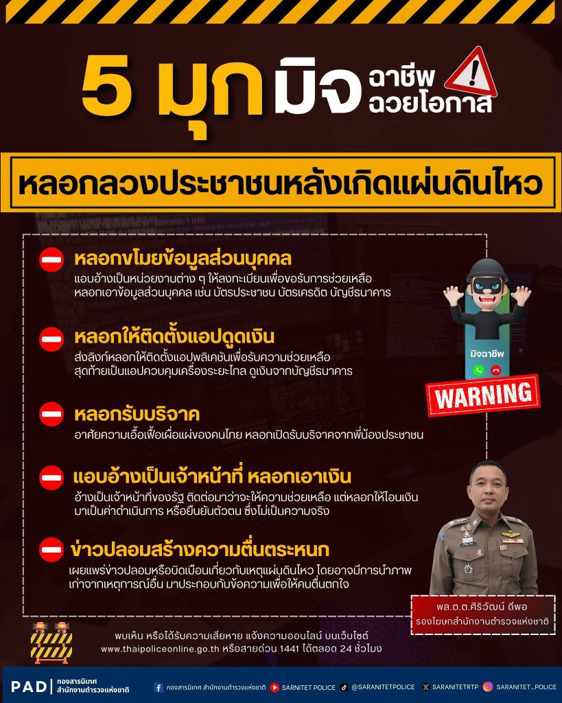 สำนักงานตำรวจแห่งชาติจึงขอเตือนให้พี่น้องประชาชนทราบถึง 5 มุกมิจฉาชีพ หลอกลวงประชาชน หลังเกิดแผ่นดินไหว ดังนี้