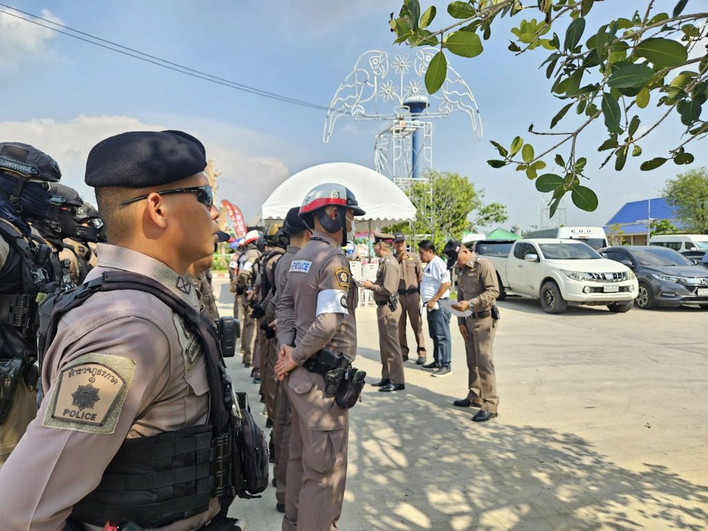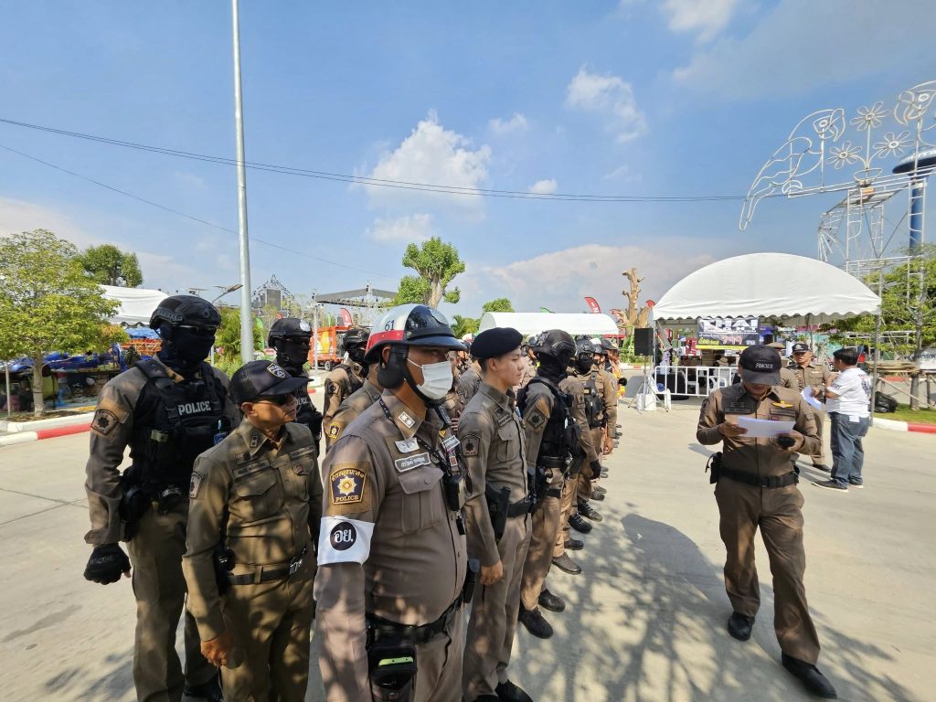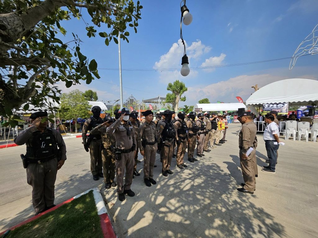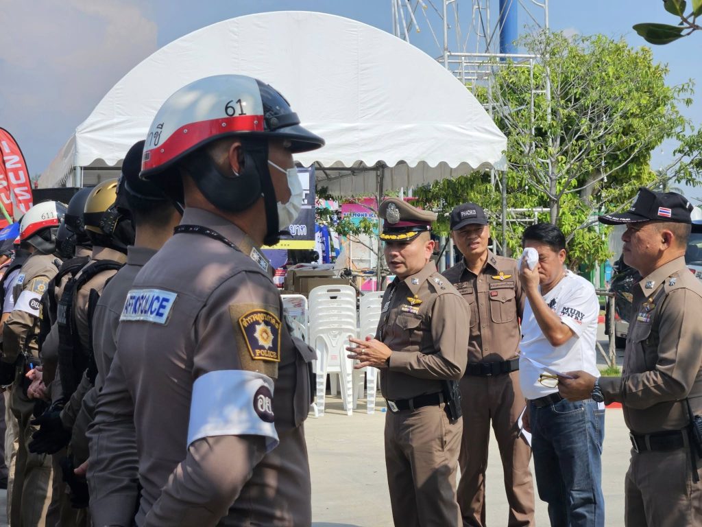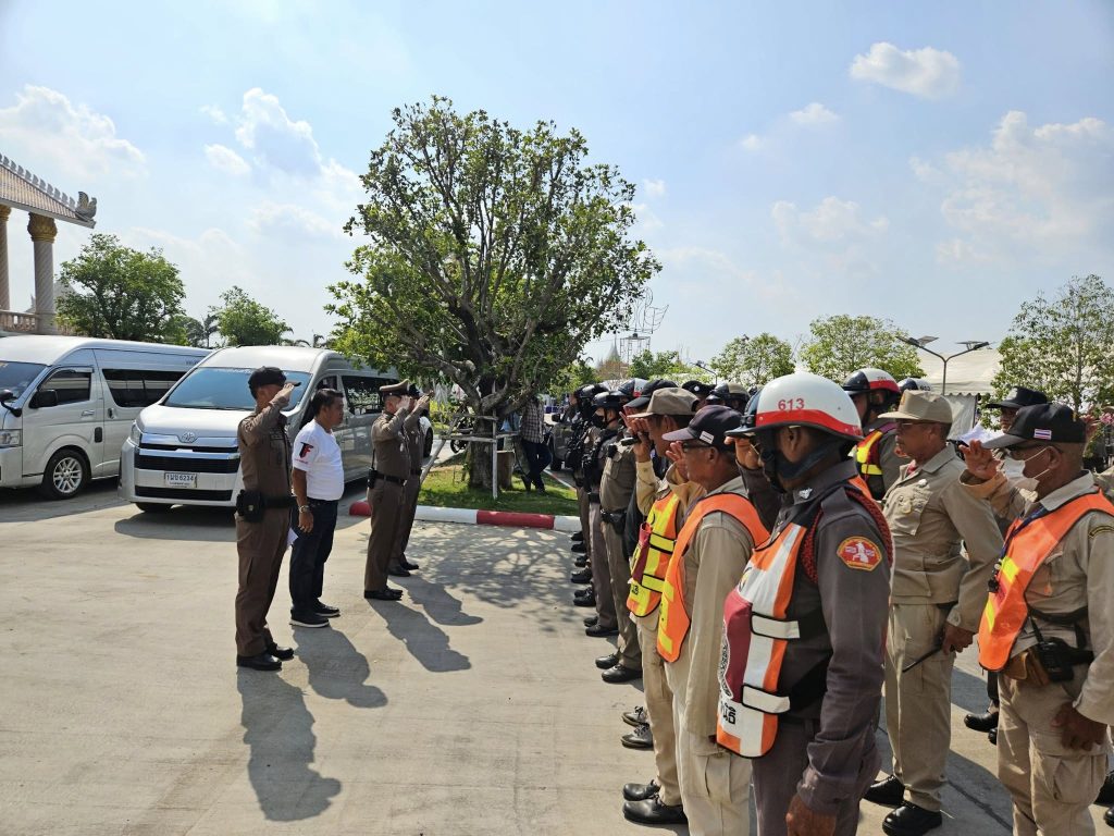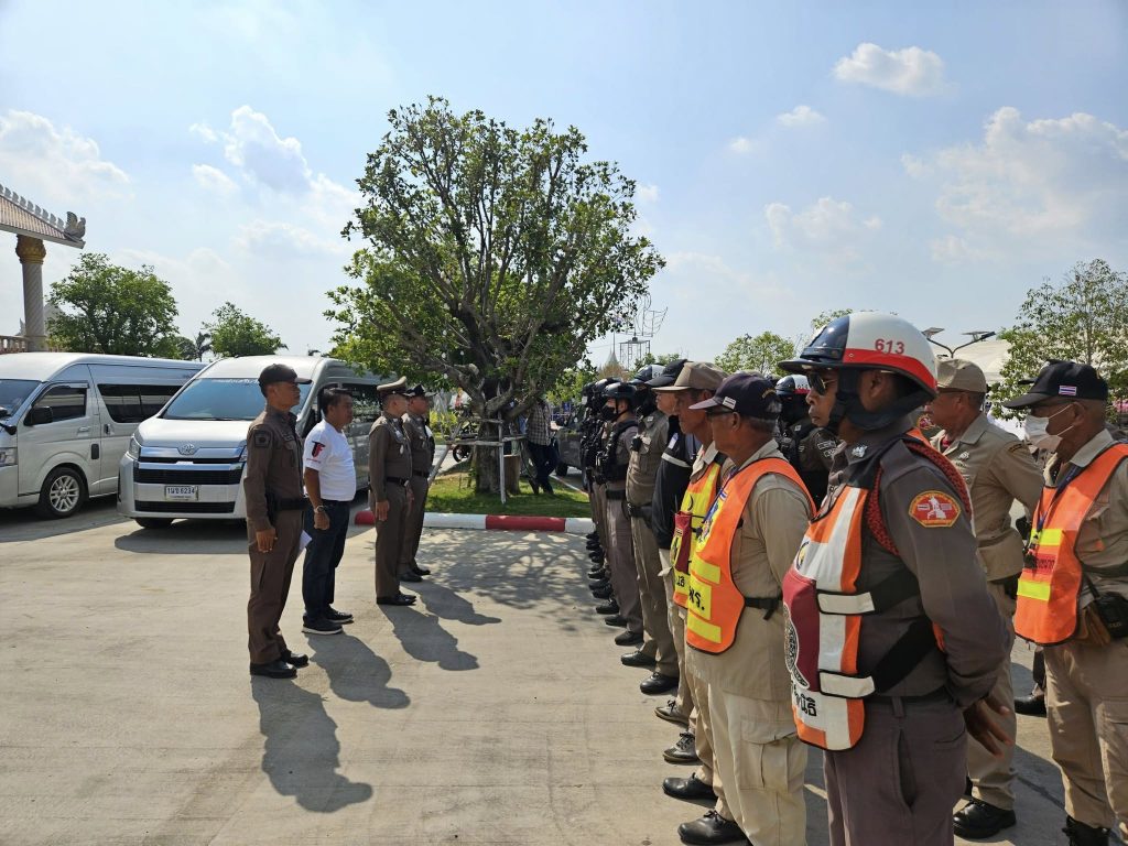 ปล่อยแถวข้าราชการตำรวจ สภ.ภาชี ชี้แจงภารกิจรักษาความสงบและอำนวยความสะดวกการจราจร งานชกมวยนายขนมต้ม ไทยไฟต์