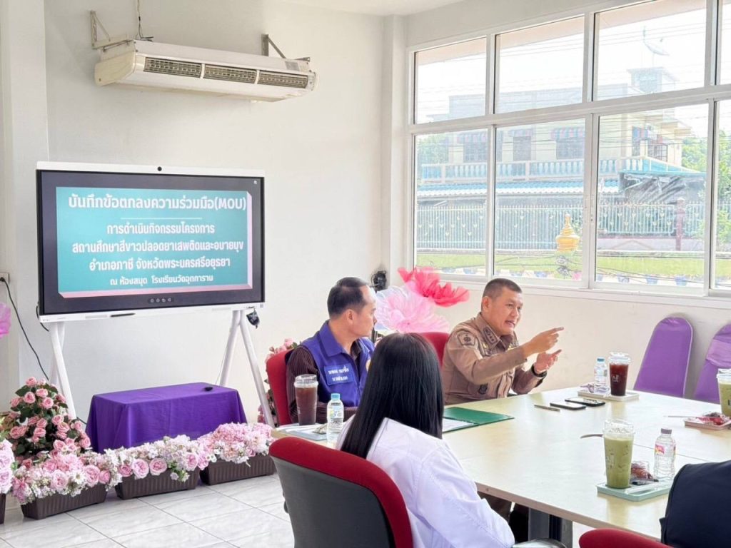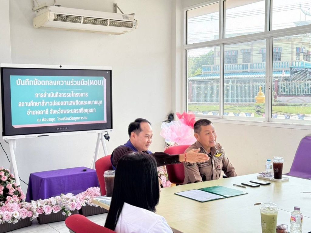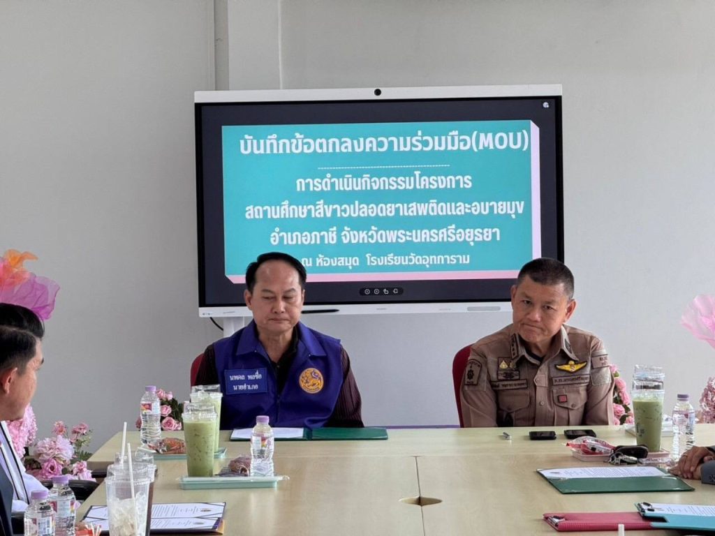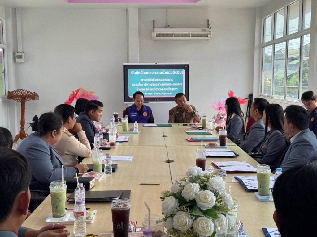 ผกก.สภ.ภาชี,นายนพดล พลซื่อ นายอำเภอภาชี,สาธารณสุขอำเภอภาชี,ผู้อำนวยการโรงเรียนในเขตอำเภอภาชี ร่วมประชุมบันทึกข้อตกลงความร่วมมือ(MOU) การดำเนินกิจกรรมโครงการสถานศึกษาสีขาวปลอดยาเสพติดและอบายมุข อำเภอภาชีจังหวัดพระนครศรีอยุธยา