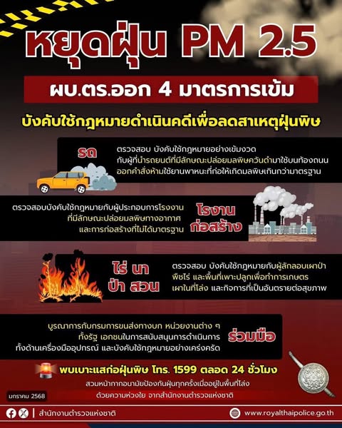 เจ้าที่สายตรวจ ตำบล สายตรวจรถยนต์ สายตรวจทุกประเภท รวมทั้งข้าราชการตำรวจทุกนาย ต้องร่วมประชาสัมพันธ์ ให้เป็นหูเป็นตาเฝ้าระวังการเกิดฝุ่นมลพิษจากสาเหตุต่างๆ การเผาขยะ การเผาเศษใบไม้ กิ่งไม้ หรือกิจกรรมใดๆ ที่ทำให้เกิดกลุ่มควัน การเผาวัชพืช เพื่อทำการเกษตร หรือพบเห็นเพลิงลุกไหม้ในลักษณะต่างๆ ให้เร่งแจ้งศูนย์วิทยุของแต่ละสถานี ประสานงานกับองค์กรปกครองท้องถิ่น เพื่อดำเนินการใน หน้าที่ ในการระงับ ยับยั้ง ดับไฟให้รวดเร็วและทันที โดยติดตามผลการดำเนินการขององค์กรท้องถิ่นนั้นๆ ด้วย อย่าปล่อยผ่านว่าได้ประสานงานแล้ว
